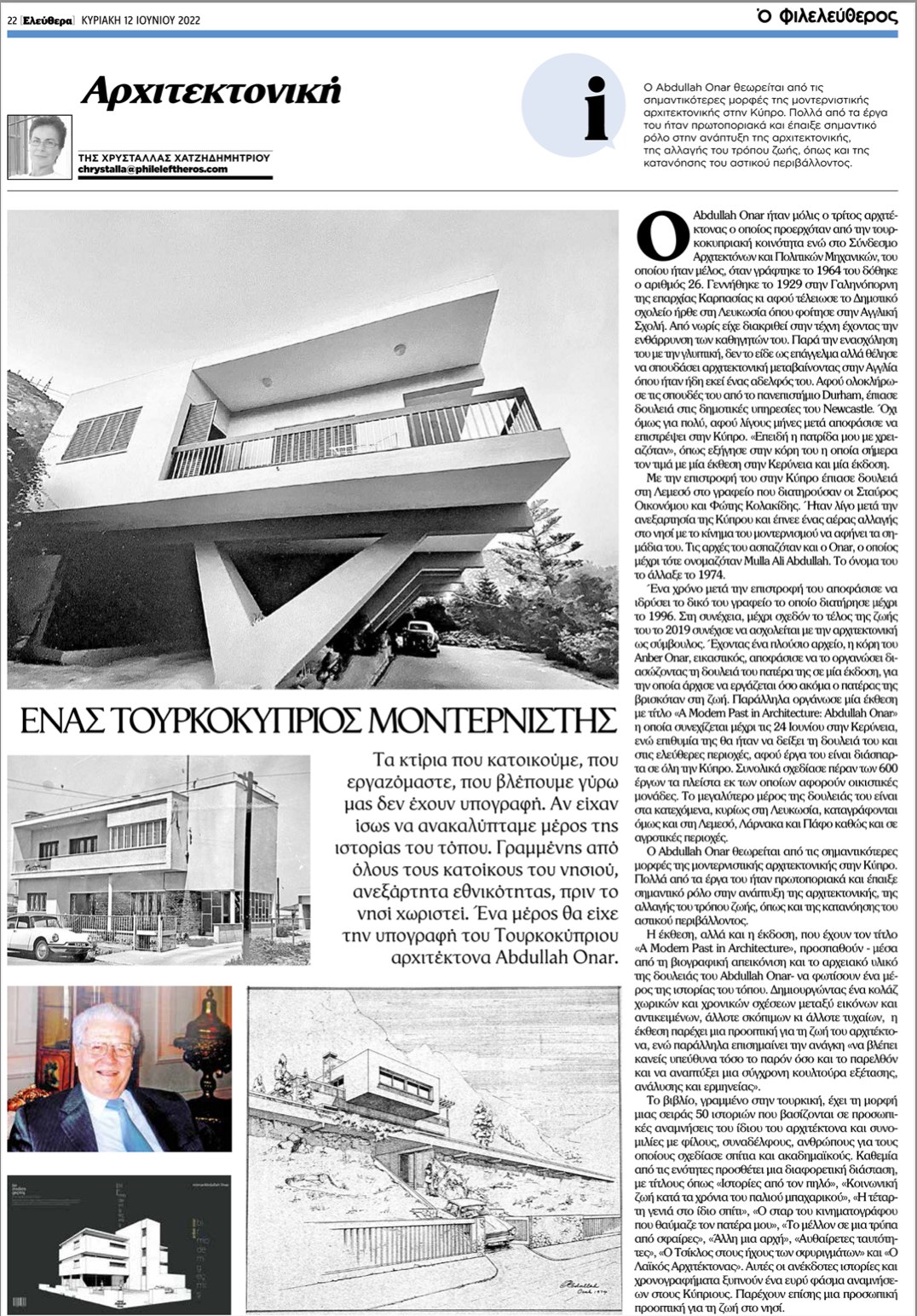 Abdullah Onar was an architect from Kaleburnu/Galinoporni, Famagusta region. He is considered as one of the most important figures of modernist architecture in Cyprus. Many of his works are pioneer and have played an important role in the development of architecture, lifestyle change as well as towards the full understanding of urban environment. In total, he designed more than 600 buildings, most of which are residential units.